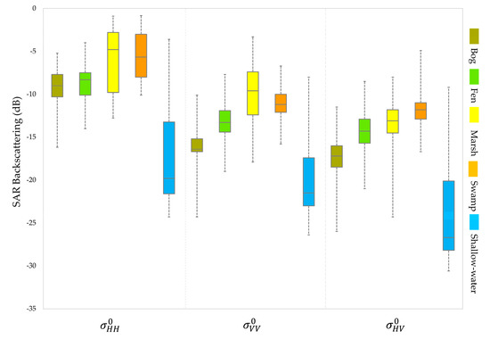 Figure 3. Box-and-whisker plots demonstrating the distribution of the SAR backscattering coefficients of FP SAR data for wetland classes obtained from the pixel values of the training data set. Note that the horizontal bars within boxes indicate median values, boxes illustrate the lower and upper quartiles, and whiskers range from minimum to maximum values.