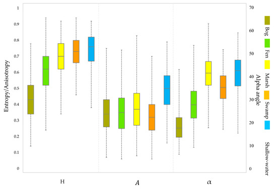 Figure 5. Box-and-whisker plots for extracted features from the Cloude-Pottier decomposition for wetland classes obtained from the pixel values of the training data set. Note: H: entropy, A: anisotropy, and α: alpha angle.