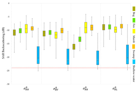 Figure 6. Box-and-whisker plots demonstrating the distribution of the SAR backscattering coefficients of CP SAR data for wetland classes obtained from the pixel values of the training data set. The red horizontal line highlights the nominal NESZ (-24 dB) of the RCM medium resolution mode.