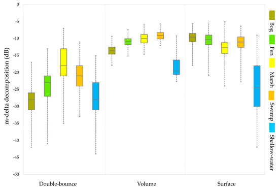A comparison between Figure 4 and Figure 7 reveals that the backscattering responses of the wetland classes in the m-delta decomposition are very similar to those of the Freeman-Durden decomposition. In particular, the marsh and swamp classes are characterized by double-bounce and volume scattering mechanisms, respectively. Surface scattering is, however, dominant for bogs and fens.