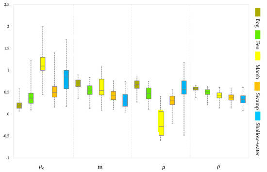Figure 8. Box-and-whisker plots for extracted features from the CP SAR data for wetland classes obtained from pixel values of the training data set. Note: µc: circular polarization ratio, m: degree of polarization, µ: conformity coefficient, and ρ: correlation coefficient.