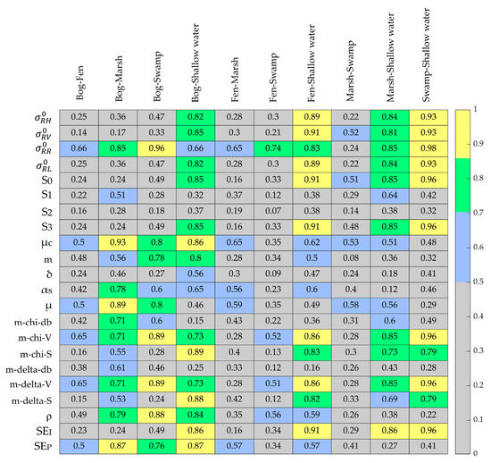 Figure 9. K-S distances between pairs of wetland classes using the extracted features from FP SAR data. Note that gray, blue, green, and yellow indicate poor, some, good, and excellent separability, respectively.