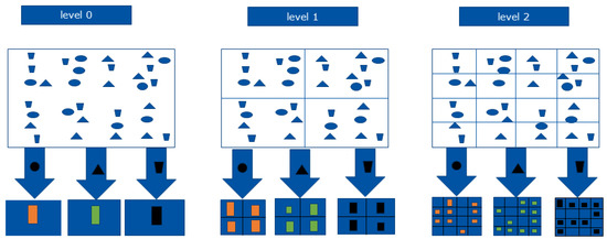 An example of a three-level pyramid model. Image is represented in three levels. For each level, the image is split into 1, 4, and 16 segments, respectively. For level 0, the representation of the image is statistical information and does not include spatial information. As the number of segments increases, more spatial information is obtained. For each subimage, the feature is independently extracted. All features are concatenated to form a feature vector to describe the image.