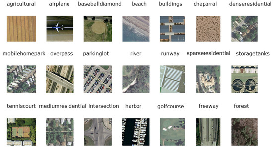 The UC Merced Land Use Dataset [17] consists of 2100 land-use images in total, collected from aerial orthoimages with a pixel resolution of one foot. The original images were downloaded from the United States Geological Survey National Map of 20 U.S. regions. The pixel resolution of this public-domain imagery was 1 foot. Each image measured pixels. These images were manually selected into 21 classes: agricultural, airplane, baseball diamond, beach, buildings, chaparral, dense residential, forest, freeway, golf course, harbor, intersection, medium-density residential, mobile-home park, overpass, parking lot, river, runway, sparse residential, storage tanks, and tennis courts. In Figure 5, we list several samples from this dataset.