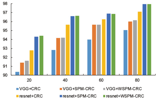 In this subsection, 20 and 20 samples per class were used for training and testing, respectively. Table 1 illustrates the effectiveness of SPM-CRC and WSPM-CRC for classifying images. For the ResNet model, when is , WSPM-CRC algorithm achieves the highest accuracy of . This is higher than the CRC method, and higher than the SPM-CRC method. For the VGG model, the WSPM-CRC algorithm exceeds the CRC method by , and the SPM-CRC method by .