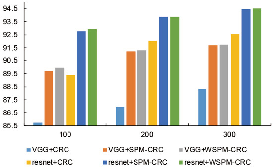 Second, we increased the number of training samples in each category to evaluate the performance of the SPM-CRC and WSPM-CRC methods. Figure 9 shows the classification rate on the RSSCN7 dataset with 100, 200, and 300 training samples in each category. From Figure 9, we found that both the SPM-CRC and WSPM-CRC method achieved superior performance to the baseline methods.