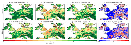| LDAS-ERA5 * (01/2008-10/2018) | ISBA Multi-layer soil model CO2-responsive version (Interactive vegetation) | Western Europe defined as longitudes from 10.5°W to 20.5°E, latitudes from 42°N to 59°N | ERA5 | SEKF | SSM (ASCAT) LAI (GEOV2) | Rescaled wg2 (Second layer of soil (1–4 cm)) LAI | Layers of soil 2 to 8 (wg2 to wg8, 1–100 cm) LAI |