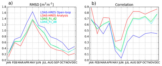 - Gibelin, A.-L.; Calvet, J.-C.; Roujean, J.-L.; Jarlan, L.; Los, S.O. Ability of the land surface model ISBA-A-gs to simulate leaf area index at global scale: Comparison with satellite products. J. Geophys. Res. 2006, 111, 1–16. [Google Scholar] [CrossRef]
