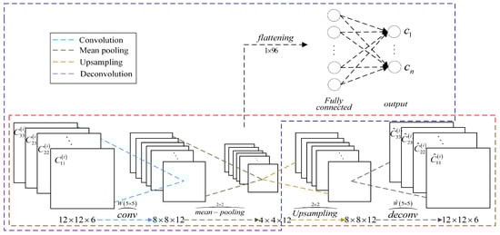 No padding convolution with kernel size 5 and stride 1 is employed in encoding part. The number of convolutional kernels is 12. In the complex domain, max pooling cannot be directly adopted. So the mean pooling with a pooling size 2 and a stride 2 is exploited in CV-CAE. According to Equation (2), with the complex-valued input patch size of , the size of feature mappings after convolution and mean pooling operation are and .