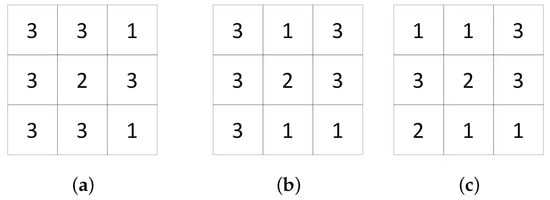 There are three different cases of PixS to be refined in Figure 3. Each digit in the PixS represents a pixel class.
