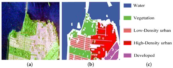 San Francisco Datasets, acquired by the AIRSAR platform, is adopted in this experiment. The Pauli RGB image and corresponding ground-truth are shown in Figure 8a,b. Five colors in ground-truth map represents five terrain types, which are vegetation, low-density urban, high-density urban, and developed. The legends are listed in Figure 8c. From Figure 8b, we can know that most of the annotated areas are irregular. Thus, the complexity of this experiment is higher than the previous two experiments.