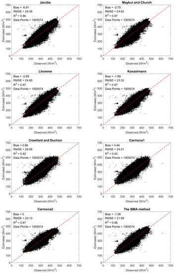 The BMA method conducts a weighted average of the individual bulk formula. The weight of each bulk formula is derived from the calibration results, and can reflect the predictive performance of each bulk formula. Therefore, the BMA method can achieve balanced results that are close to those of Carmona2 and better than the arithmetic average of those for seven selected bulk formulae, with a BIAS, RMSE and R2 of −1.08 W·m−2, 21.99 W·m−2 and 0.87, respectively.
