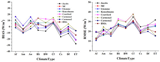 Bulk formulae mainly depend on the screen-level air temperature, relative humidity and cloud properties (e.g., cloud fraction) [,,]. The primary criteria for climatic type classification are temperature and precipitation. As a result, we divided the sites as nine groups according to the Koppen climate classification system, including Af (tropical rainforest climate, 3 sites), Am (tropical monsoon climate, 1 site), Aw (tropical wet and dry or savanna climate, 2 sites), BS (semiarid, 5 sites), BW (desert climate, 3 sites), Cf (temperate or subtropical hot summer climates, 9 sites), Cs (Mediterranean climates, 2 sites), Df (warm summer continental climates, 13 sites), and ET (tundra climate, 5 sites). The performance of the cloudy-sky bulk formulae and BMA method were investigated considering different climate types.