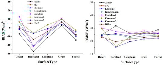 The land cover type is another factor that regulates Earth-atmosphere interactions. We divided the sites into five types, i.e., desert (3 sites), bare land (4 sites), cropland (4 sites), grass (12 sites), and forest (14 sites), to investigate the accuracy of the bulk formula and the BMA method. The evaluation results are shown in Figure 4. Similar to Figure 3, there are larger spread in the BIAS and RMSE. Considering the BIAS and RMSE of each bulk formulae and the BMA over all land cover types, it is difficult to conclude which one performs the best or the worst as a whole. The statistical results in Table 6 show that all methods underestimate the SDLR over bare land and forest, with BIAS ranging from −27.66 to −2.65 W·m−2, and overestimate the SDLR over Grassland, with BIAS ranging from 2.89 to 10.63 W·m−2. The R2 of all methods are larger than 0.64. The RMSE of Carmona2 is better than that of the other methods under most conditions. According to the BIAS values, Jacobs performs the best over grassland, Carmona1 performs well over bare land and forest, and Carmona2 performs well over desert and cropland. BMA achieves a balanced BIAS and RMSE between the best and worst model for each land cover type.