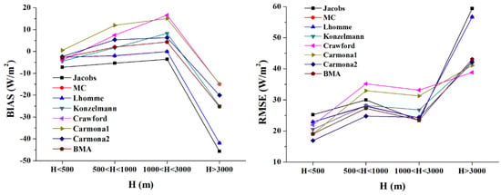 The vertical zonality is an important component of the rule of territorial differentiation. The driving factors behind the vertical zonality are water vapor and temperature, and elevation is a direct quantitative index of vertical zonality. We divided the sites into four categories according to the elevation range (≤500 m (23 sites), 500–1000 m (8 sites), 1000–3000 m (7 sites), and ≥3000 m (6 sites)) and assessed the cloudy-sky bulk formulae and BMA method. Figure 5 shows a trend that the absolute values of the BIAS and the RMSE increase with surface elevation. Table 7 shows that the cloudy-sky bulk formulae perform best when the surface elevation is less than 500 m. The BIAS ranges from −7.25 to 0.56 W·m−2, the RMSE ranges from 16.91 to 25.21 W·m−2, and R2 is approximately 0.9. The bulk formulae perform the worst when the surface elevation is higher than 3000 m. The bulk formulae underestimate the SDLR when the elevation is higher than 3000 m. The BIAS ranges from −45.72 to −14.88 W·m−2, the RMSE ranges from 38.85 to 59.41 W·m−2, and R2 is approximately 0.6. The BMA achieves a balanced BIAS and RMSE between the best and worst model for each climate type. This is consistent with the climate and surface type evaluation results.