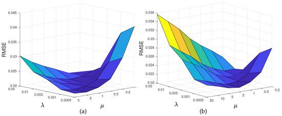 RMSE as a function of the regularization parameters for the proposed method with using Gaussian kernel.
