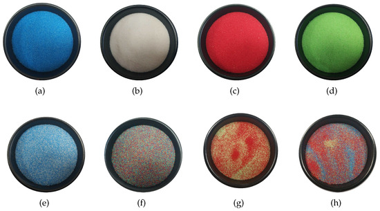 Laboratory created data for unmixing performance evaluation (RGB images). Subfigures (a–d): pure quartz sand of 0.03 mm of four colors, and they serve as pure materials for providing endmembers. Subfigures (e,f): uniform mixtures of sand of two (e) and three colors (f). Subfigures (g,h): mixtures with spatial patterns of sand of two (g) and three colors (h). Square regions of 60-by-60 pixels in the center of each subfigures are clipped out and used in experiments.
