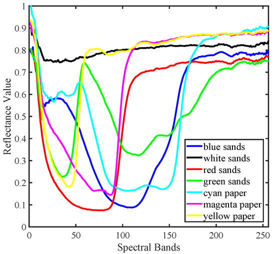 In order to perform quantitive evaluation of unmixing performance, we designed several experimental scenes in our laboratory with the GaiaField (Sichuan Dualix Spectral Image Technology CO. Ltd., GaiaField-V10) and GaiaSorter systems. Our GaiaField is a push-boom imaging spectrometer with a HSIA-OL50 lens, covering the visible and NIR wavelengths ranging from 400 nm to 1000 nm. GaiaSorter sets an environment that isolates external lights, and is endowed with a conveyer to move samples for the push-boom imaging. A dataset is created by imaging these scenes with the hyperspectral camera in our laboratory, providing mixtures with 256 wavelength bands. The experimental settings are strictly controlled so that pure material spectral signatures and material compositions are known. See [43,44] for experiment and data description in detail.