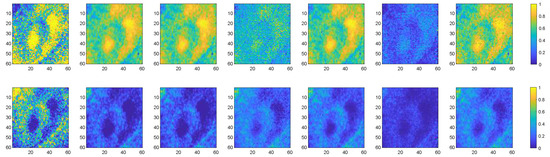 The obtained RMSEs are reported in Table 3, with the algorithm parameters listed in Table A3. We observe that the proposed algorithm achieves the lowest RMSEs, and the proposed algorithm with automatically set bandwidth also leads to satisfactory performance. For data and , abundance maps estimated by the compared algorithms are shown in Figure 6 and Figure 7. We see that most algorithms recovered the spatial pattern of the abundance maps. However, the K-Hype algorithm produces a low contrast map for the first component in . The proposed algorithm results in sharper abundance maps with lowest RMSEs. Experiments with these labeled real data show the benefit of the proposed algorithm.