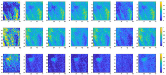 Abundances maps of selected materials of . From left to right: FCLS, SUnSAL, K-Hype (), NDU (), IIKNMF (), Proposed (). From top to bottom: the 1st endmember, the 6th endmember, the 10th endmember.