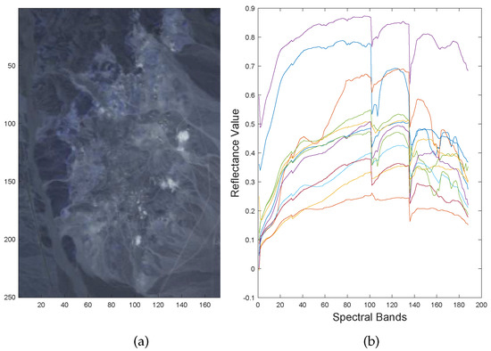 AVIRIS Cuprite data (denoted by ) used in the experiment. (a) The false color image illustrated with bands of the sub-image of the AVIRIS Cuprite data set. (b) Twelve endmembers used for unmixing.
