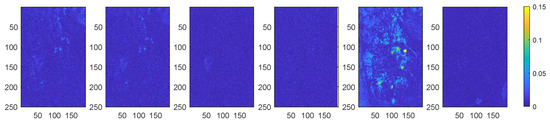 Maps of reconstruction error. From left to right: FCLS, SUnSAL, K-Hype (), NDU (), IIKNMF (), Proposed ().