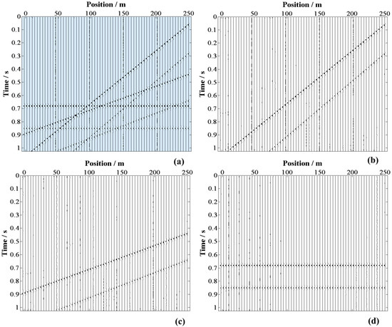 Demonstration of dip filter using f-x EMD. (a) The synthetic data, (b) high-pass dip filtered data, (c) mid-pass dip filtered data, (d) low-pass dip filtered data.