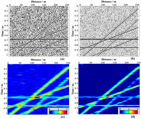 In Figure 5, we add noise with different noise levels into the same data (Figure 4a) to obtain two noisy datasets with similar useful signal (Figure 5a,b). The added noise is Gaussian random noise and the distribution is and , respectively. Then, we calculate the similarity spectrum (Figure 5c) between the two noisy data and apply a soft threshold function to it. In this spectrum, we observe a large similarity difference between signal and noise. After the soft thresholding, the spectrum highlights the useful signal.