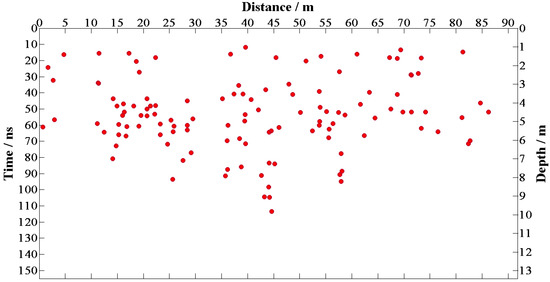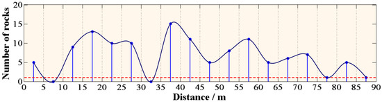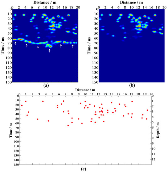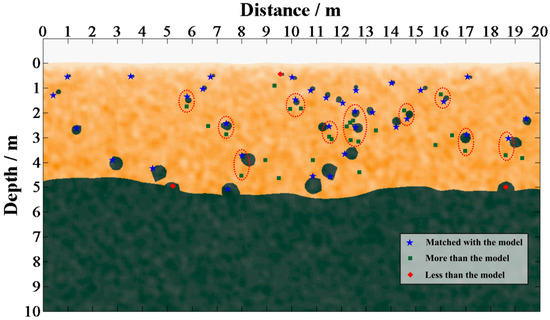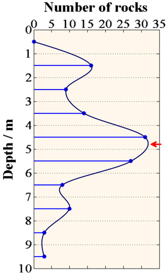 The detection rate of the above-mentioned forward result is , the missed detection rate is , and the false alarm rate is . It can be seen that our method has a high detection rate and a low missed detection rate. The reason for missed detection is that the rock is close to the reflector so that the diffractions are interfered with by reflections. The false alarm rate is relatively high; there are two main reasons for the excessive extraction of rocks: (1) In the rock enrichment area (9–13 m), diffraction interferences decrease the accuracy of local maximum picking; (2) bigger rocks allow the diffractions generated by their upper and lower interfaces to be recognized, which generates serval “rock pairs” (red circle) in extracted results. After removing these “rock pairs”, the actual false alarm rate drops to . Although there are a few errors in the extraction results, the rock distribution is close to the model, which is acceptable for the rock analysis.