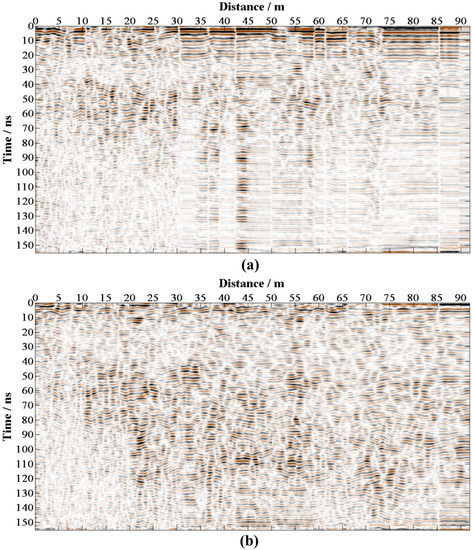 The two advantages of f-x EMD are convenience and stability. The f-x EMD is a data-driven f-k filter and does not require the predefined muting zone in the f-k domain, which is easily embedded into field data processing. Moreover, unlike convolutional operator-based denoising methods (such as f-x predictive filter), f-x EMD can deal with an irregular spatial sampling dataset [13,23]. For data acquisition of LPR, irregular spatial sampling is inevitable because of the complex terrain, finite time and expensive cost. Therefore, f-x EMD is a promising tool in LPR data processing.
