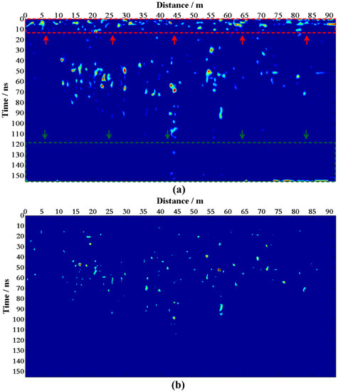 In the forward results (Figure 5b,c), there are two types of useful signals, i.e., reflections (0–6 and 60–80 ns) and diffractions (10–60 ns). Since our focus is rock positioning, we mute the shallow reflections before the dip filter.