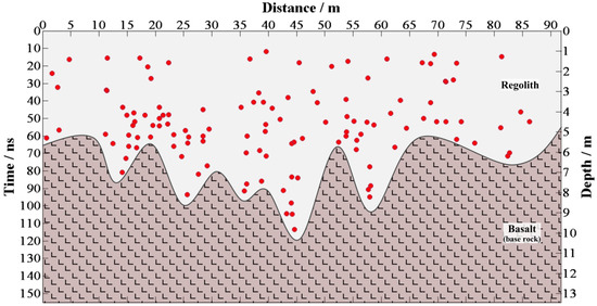 After proving the effectiveness of our proposed method, we process the LPR CH-2 data. The results of the dip filter are shown in Figure 10 and the corresponding local similarity spectra are shown in Figure 11a. From Figure 10, we see that most diffractions locate in 15–118 ns. The muted spectrum is shown in Figure 11b. Then, we utilize the result of rock positioning (Figure 12) to research the evolution of regolith on the landing site.