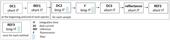 All the measurements were acquired with an Ocean Optics® USB2000+ (Ocean Optics®, Largo, FL, USA) spectrometer and recorded with SpectraSuite (Ocean Optics®) software. All references (REFs) were collected using a reflectance standard panel (Spectralon® Diffuse Reflectance Standards, Labsphere®, North Sutton, NH, USA). Dark current (DC) and reference measurements were collected before and after each sample measurement, for DC correction and to check for stability during measurements (Figure 2). In addition, one reference measurement (REF3 in Figure 2) with the filter and at the long integration time (IT) was recorded for each method, to be used in baseline calculations (see 2.5. Baseline for details of using REF3).