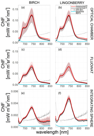 Red to far-red ChlF ratios have been used as indicators of [Chl] [41,42] and to track physiological stress responses [15,17,43,44]. Variations in red to far-red ChlF have been also used to estimate the relative contribution of PSI and PSII to the ChlF signal [45,46]. It is, therefore, important to ensure that the baseline effect, when present, is properly addressed. Comparison of measured and corrected spectra showed that baseline application changed the red/far-red ratio by only 2–3% (OC) and by 1.1–2.1% (FW). The larger baseline effect in the OC compared to the FW could be explained in terms of enhanced reflectance in the OC where the specular reflectance component is also contributing to the reflected signal (Supplementary Material, Figure S5). Overall, despite the limited impact of the baseline correction method on the shape of the resulting ChlF spectra, we recommend taking into account the possibility of a significant baseline during data interpretation. Using spectrometers with a high dynamic range so as not to saturate the signal, and optical filters with an OD equal to or larger than 4, is also recommended. When applying this baseline correction method, we also recommend measuring an REF3 for each sample rather than for each setup as we did in the present study, since filter repositioning from sample to sample might cause some variation in the REF3, which is probably one of the reasons why the correction of the black tape ChlF spectra (Figure S1) presented still some uncorrected “photons” below 680 nm.