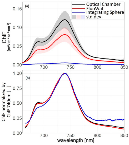 Chlorophyll fluorescence spectra of lingonberry in optical chamber (black), FluoWat (red), and integrating sphere (blue) methods. (a) measured spectra, standard deviation (n = 4–5) is marked as shading; (b) spectra normalized to F740.