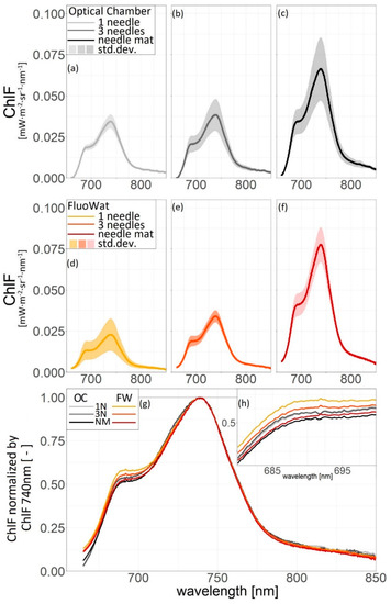 As expected, the intensity of the recorded ChlF spectra increased with the number of needles both in the OC and FW setups, with smaller amplitude for the 1N arrangement, intermediate amplitude for the 3N, and largest for the needle mats (Figure 6a–c and Figure 6d–f respectively). Again, we then normalized the ChlF spectra to the far-red peak at 740 nm in order to examine the impact of needle arrangement on the shape of the ChlF spectra (Figure 6g,h). We found a general decreasing trend (not significant) in the normalized far-red peak (or the red/far-red ratio) with increasing number of needles in both OC and FW methods, possibly due to enhanced re-absorption.