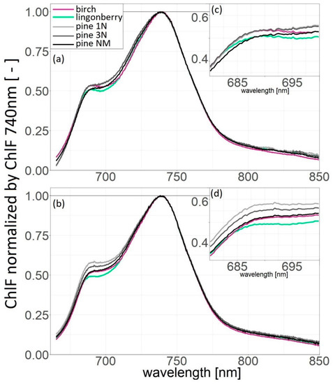 Light sources were adjusted for each method to yield similar low light intensities at the leaf surface (as measured with an LI-250A PAR sensor, LI-COR® Inc., Lincoln, NE, USA) (Table 1). Despite the obvious decrease in SNR, we purposefully selected a low light intensity (38–50 µmol PAR) to minimize any potential differences in ChlF spectral properties due to light-induced photochemical quenching (PQ) and non-photochemical quenching (NPQ) dynamics [11]. To ensure we were comparing ChlF spectra from fully functional leaves of similar physiological states, we calculated the maximum quantum yield of photochemistry based on the ratio of variable to maximal fluorescence, or FV/FM [37], and used it as an indicator of photosynthetic functionality [24]. We used a PAM-2500 fluorometer (Heinz Walz GmbH, Effeltrich, Germany) and the cut shoots after one hour of dark acclimation (n = 5). FV/FM remained at the level of 0.78 ± 0.023 for lingonberry, 0.79 ± 0.012 for birch, and 0.83 ± 0.012 for pine, which is well within the range of non-stressed summer values for each of the respective species [38,39]. More details can be found in Table 1 and the sections below.