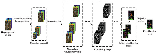 For the purpose of improving the separability of the hyperspectral features of different features, we choose Gaussian pyramid for multi-scale feature extraction. Figure 1 shows the schematic diagram of the proposed classification method, which consists of the following major steps: First, the HSI is decomposed into several Gaussian pyramids to extract multi-scale features. Second, we construct and optimize probability maps in each layer of the Gaussian pyramid. Finally, the final classification map is acquired by the majority voting method.