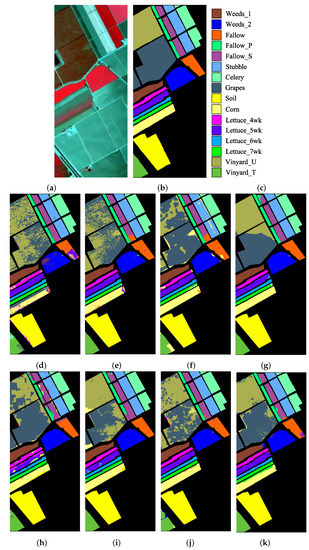 (3) The Salinas image was also captured by the AVIRIS sensor over Salinas Valley, California. The size of the image is . The geometric resolution of this image is 3.7 m per pixel. Similar to the Indian Pines image, 20 water absorption bands (nos. 108–112, 154–167, and 224) were discarded. The false-color composite and the corresponding reference data of the Salinas image are shown in Figure 4a–c.