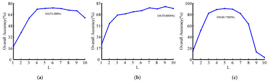 Analysis of the effect of the parameter L (the number of layers in the Gaussian pyramid). (a) Indian Pines dataset. (b) University of Pavia dataset. (c) Salinas dataset.