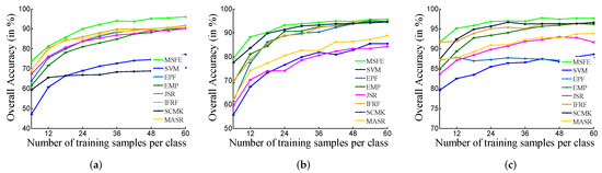 Classification results with varying number of training samples by SVM, EMP, EPF, IFRF, JSR, SCMK, MASR, and the proposed method, MSFE. (a) Indian Pines dataset, (b) University of Pavia dataset, (c) Salinas dataset.