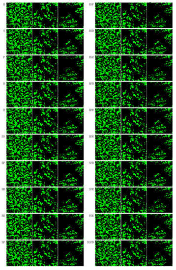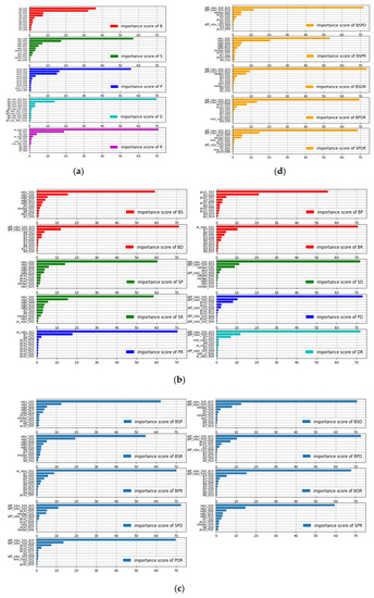 A total of 131 multi-features (MF) (Table 2) were selected as predictor variables, and were combined into 30 feature subsets (MFS) containing single feature and combined feature types (Figure 5). In these subsets, the first 10 variables with the highest importance scores were used as model inputs. The 30 MFSs were further divided into five multi-patterns (MP) named: I, II, III, IV, and V. These were based on the number of feature types contained in each MFS (Figure 5). For example, the I pattern indicated that the features used for classification were from the same single feature type (e.g., B, S, P, D, and R). The II pattern suggested that the features were from the combined feature type (e.g., BS, BP, BD, BR, SP, SD, SR, PD, PR, and DR).