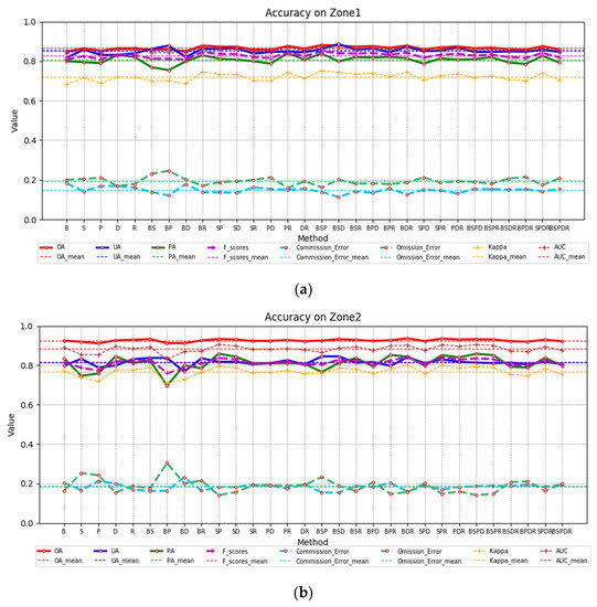 The results from Table 4 suggest that the spectral indices (S) were the main factor influencing the accuracy of the results in Zone 2 (Table 4). This zone was located in a mixed urban area. Spectral indices can enhance the spectral information of different types of terrain, providing improved classification performance. For example, the NDVI used in this paper can enhance vegetation information, and the NDBI can enhance impermeable surface information. Furthermore, the MNDWI can enhance water information, and the NDSI can enhance cloud, snow, and bare soil information. Crop information can be more effectively retrieved from complex mixed backgrounds using these methods. Thus, the crop classification of urban mixed areas should be combined with an assessment of the regional environment. Moreover, a spectral index must be selected that can effectively enhance the terrain information and improve classification accuracy.