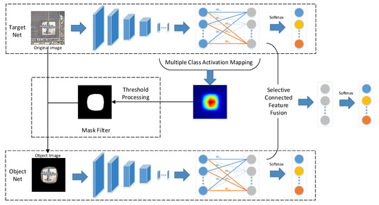 The overall network, which consists of two subnetworks, i.e., the target net and the object net, is illustrated in Figure 1. First, the target net is used to extract features from the original image. Second, with the help of MultiCAM, the discriminative object parts are located, and the object saliency map is obtained. Third, based on the object saliency map, the object image is generated by applying a mask filter to the original image, which restores the object and filters the background. Then, the object image is fed into the object net to realize feature extraction and concentrate on the object. Finally, selective connected feature fusion is applied to classify the images by fusing the features from the two subnetworks. The key parts of the proposed network are addressed in detail in the following sections.