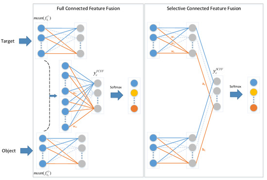 where is obtained from the fully connected layer in the target net. Although the expressions on both sides of Equation (11) are equivalent, the corresponding numbers of parameters are different. After global average pooling, the number of parameters in FCFF is , while SCFF requires parameters. However, in the fitting process, we train only the weights in Equations (9) and (10) and leave the parameters in the other layers unchanged. According to Equation (9), the number of parameters needed to be trained in FCFF is , while the number is in the SCFF method based on Equation (10). Therefore, the computational complexity of the feature fusion of SCFF is far less than that of FCFF. In addition, SCFF utilizes features from two networks before the softmax layer. If the target net and the object net achieve optimal performance together, which means that the extracted features from the two networks have sufficient representation ability, SCFF can achieve greater performance improvement. A comparison of the two feature fusion methods will be presented in the experiment section.