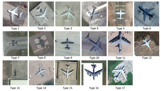 In a short period of time, an aircraft generally remains at the same position, and the differences among remote sensing images are not obvious. Random selection would result in similar samples being placed into the training set and the testing set, leading to high correlation between the training set and testing set. Therefore, we divide the aircraft dataset into two parts: samples from odd years and even years. On the basis of the sample division method of two existing FGVC datasets, i.e., the Bird dataset [17] and the Standford Cars dataset [19], for each aircraft type, we randomly select 30 to 60 samples from the odd year images as the training set and select 21 to 60 samples from the even year images as the testing set. The sample statistics of the two existing FGVC datasets and our aircraft dataset are listed in Table 1. The number of samples for each category in our dataset is comparable with that of the widely used FGVC datasets. Finally, our dataset includes 982 samples in the training set and 963 samples in the testing set. There are 17 types of aircraft in our dataset, as shown in Figure 4.