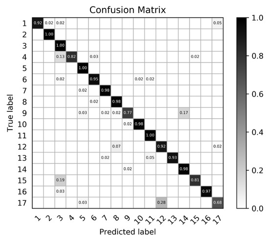 The accuracy results of the different methods are listed in Table 2. RBM-DBN is the method based on a deep belief network and restricted Boltzmann machine proposed in [13]. Res-MultiCAM-MF(MV)-SCFF is the best combination in the proposed algorithm, where Res is the abbreviation of ResNet and MF(MV) denotes the mask filter based on the maximum value threshold processing according to Equation (5). The classification accuracy of each type in the confusion matrix is illustrated in Figure 5, which shows that the proposed method can effectively distinguish aircraft types. Furthermore, some aircraft types with similar appearance are more likely to be misclassified. For example, in Figure 4, type 9 and type 14 are similar in shape and size. The effect of each method on the classification performance will be analyzed in the following section.