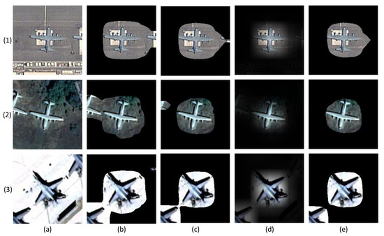 As shown by the visualized masks in Figure 7, the object saliency regions generated by the average value threshold processing are larger than those obtained based on the maximum value threshold processing. In this case, more of the interfering background is included in the object saliency region, as shown in Figure 7b,c. Although the ReLU function maintains the weight difference of the multiclass activation map, the gradual change of the mask boundary blurs the marginal part of the object. Consequently, the mask filter based on maximum value threshold processing preserves the aircraft region and suppresses the background interference to the greatest extent.