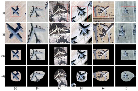 The test results also confirm the analysis in Section 2.2. Cropping the bounding box and resizing to a uniform size inevitably changes the aircraft shape. Concretely, if the bounding box is square, the resizing operation enlarges the object, as shown in Figure 8a. For a rectangle bounding box, the length-width ratio is altered, as shown in Figure 8b. Cropping and resizing in these two situations distort the object’s original scale information, which increases the difficulty of aircraft type classification. Moreover, if the bounding box is inaccurate, the category prediction accuracy may be affected by other factors, such as the target shadow (Figure 8c), part of an adjacent aircraft of the same type (Figure 8d), part of an adjacent aircraft of a different type (Figure 8d), and other types of background (Figure 8f). Therefore, cropping and resizing operations are not suitable in the case of aircraft recognition. By contrast, two types of mask operations can protect the object’s scale information. Additionally, comparison of the visualization results in Figure 8(3,4) indicates that MF has a better background suppression capability.