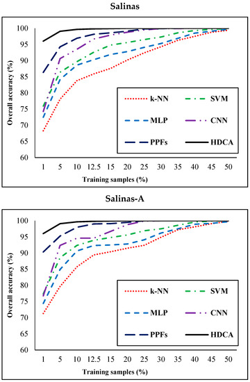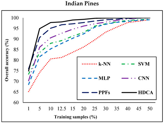| Dataset | Training Samples (%) | k-NN | SVM | MLP | CNN | PPFs | Proposed (HDCA) |